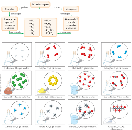 Substância composta ou composto químico: formada por átomos de dois ou mais elementos químicos diferentes, ou seja, sofre decomposição.